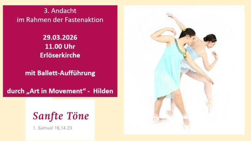 Das Team der Fastenaktion lädt am Palmsonntag zu einer ganz besonderen Andacht ein: Ballett-Tänzerinnen der Tanzschule „Art in Movement“ werden uns das Thema der 6. Fastenwoche – „Sanfte Töne“ –…