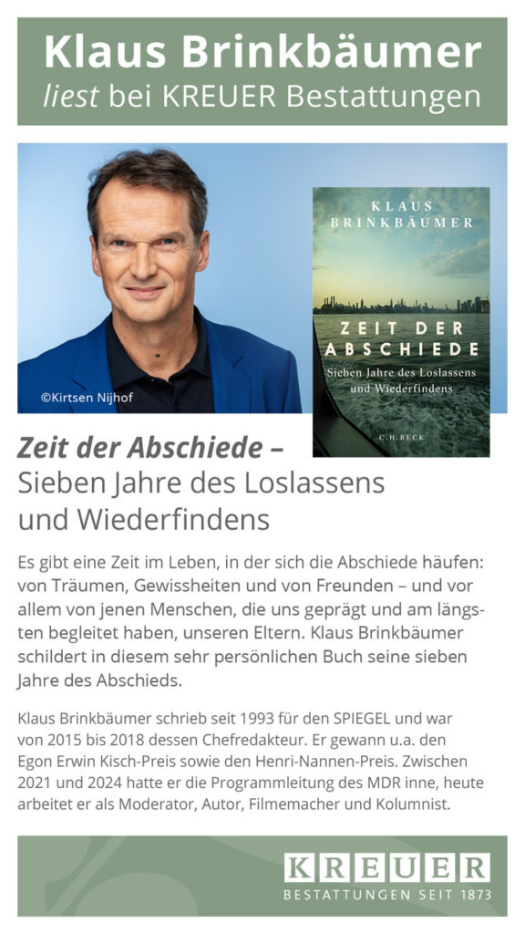 Am Mittwoch, den 26.11.25 liest der Autor, Journalist und Moderator Klaus Brinkbäumer bei uns in der Trauerhalle aus seinem Buch „Zeit der Abschiede – Sieben Jahre des Loslassen und Wiederfindens“.